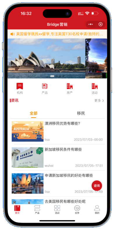 多级分类呈现移民套餐/移民项目/房产产品等,直至在线咨询及扫码获客。